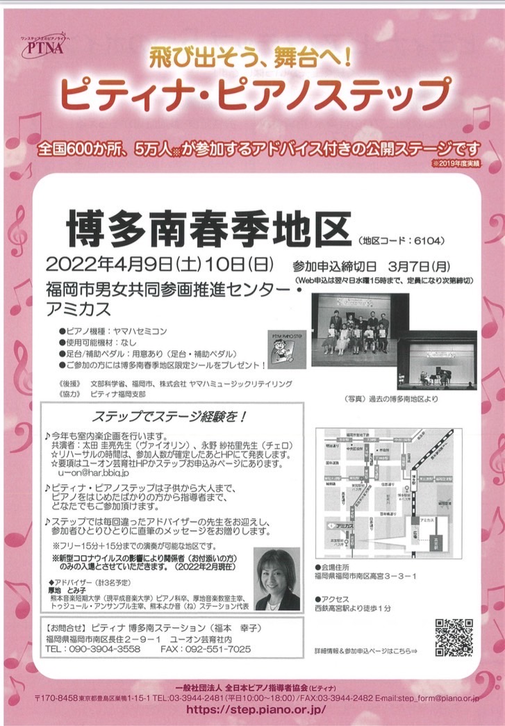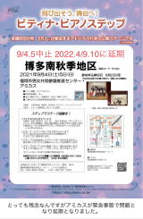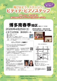 毎年好評なこの企画・・・・実施事務局の用意した弦楽器奏者と、初心者用のオブリガート付ピアノ曲から本格的な室内楽曲まで、ピティナ・ピアノステップのステージで「夢の共演」をすることができます。アンサンブルに造詣の深い先生のリハーサルアドバイス…当日はアドバイザーの先生方からのメッセージ用紙や講評がいただけます。この機会に室内楽に親しんでみませんか?